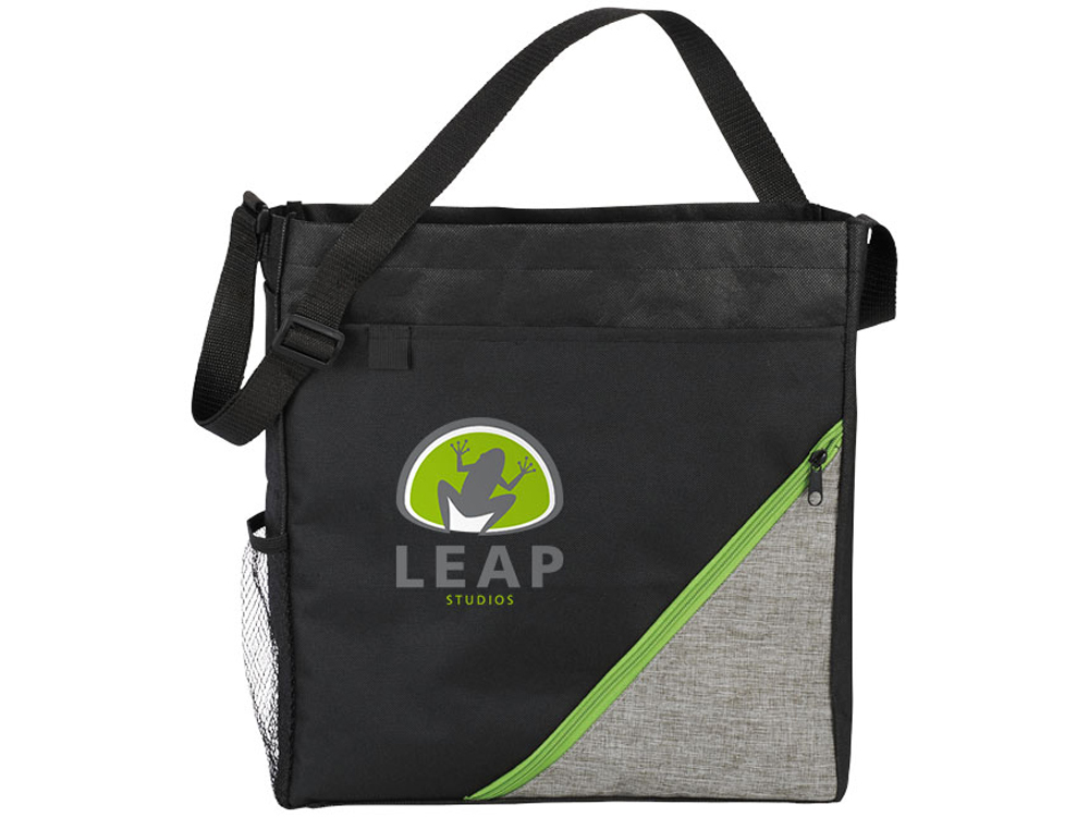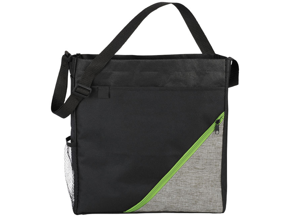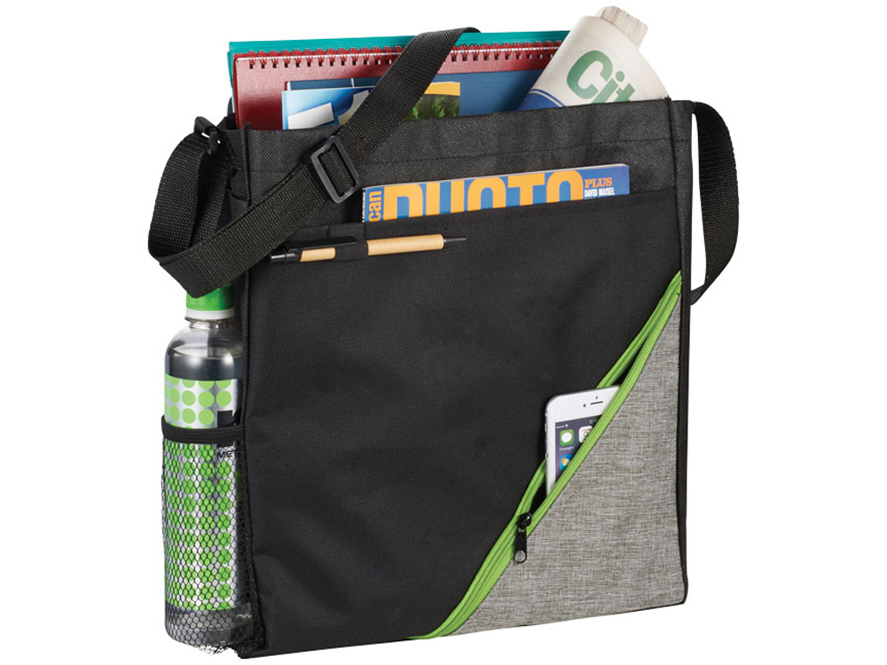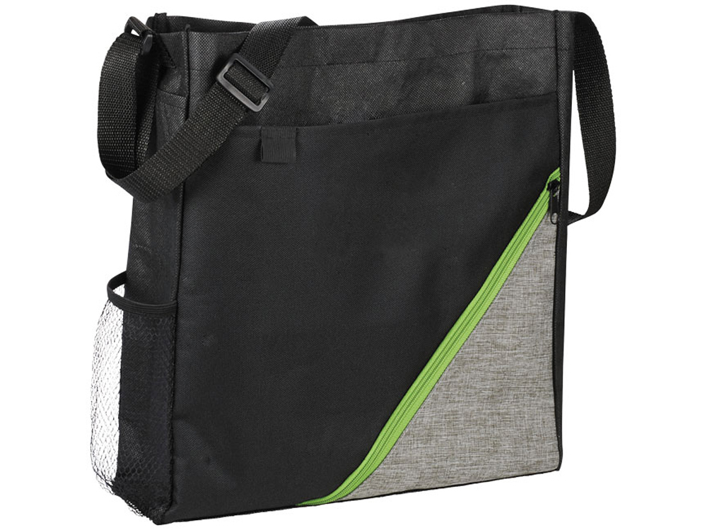 Сумка Corner через плечо. Сумка для покупок с большим основным отделением на липучке, петелькой для ручки и холдером для бутылки. Скошенный карман с графитовыми аксессуарами и застежкой молнией. Регулируемый ремень на плечо. 600D полиэстер с 80 г полипропиленовыми акцентами.