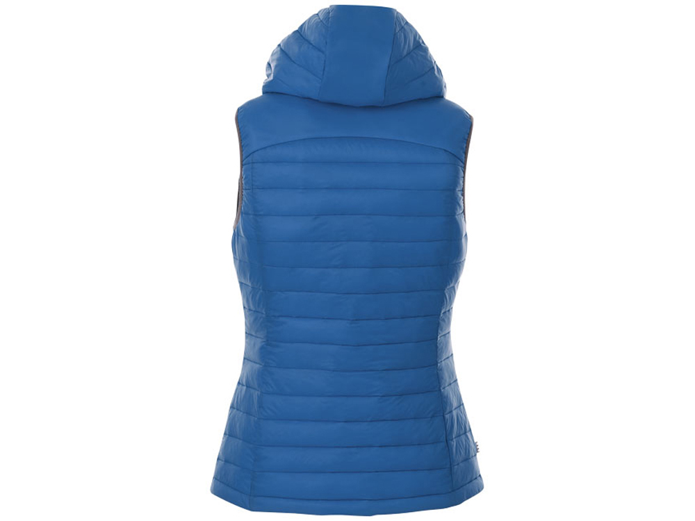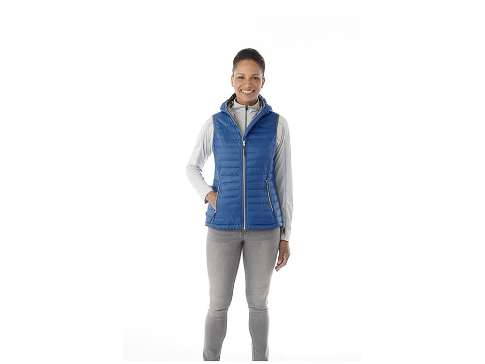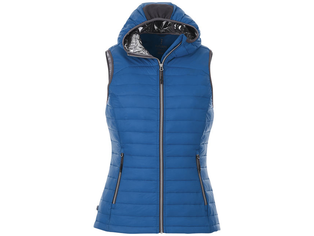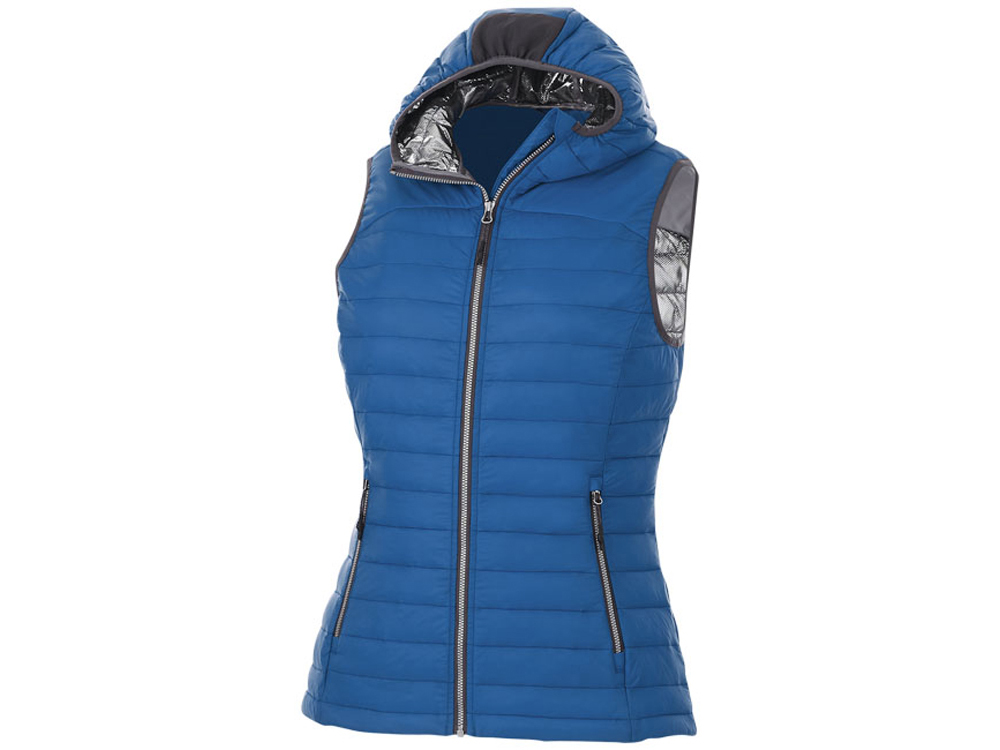 Утепленный женский жилет Junction. Упаковывается в нижний левый карман. Внутренний выход для медиапроводов. Эластичные завязки с фиксаторами. Манжеты-резинки контрастного цвета. Молния по центру с отражающей лентой. Передний карман на молнии. Петелька-вешалка. Комфортный ярлык-трансфер на изделии. 100% нейлоновая тканая матовая отделка 380T, водоотталкивающая и пухонепроницаемая ткань. 100% полиэстеровый наполнитель из искусственного пуха.