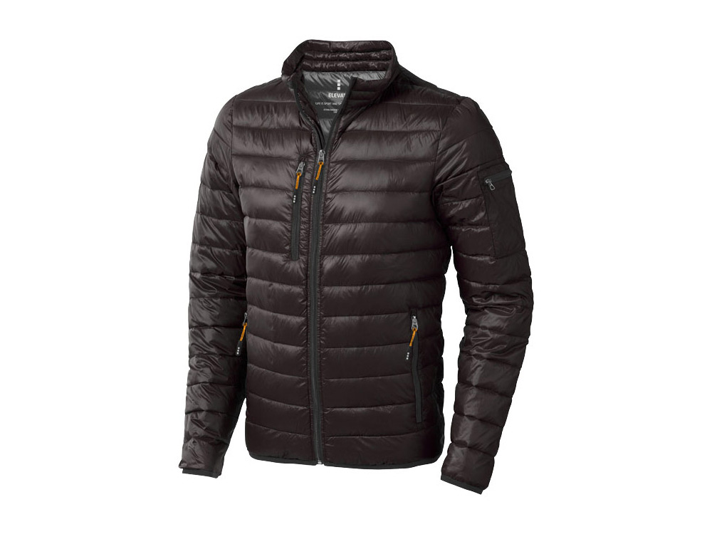 Легкая куртка Scotia. Стандартный покрой. Ткань не пропускает пух. Карманы для рук и нагрудный на молнии. Карман на рукаве на молнии можно использовать для нанесения. Резинка на манжетах и внизу куртки. Ремешки на собачку (второй комплект в цвете антрацит). Внутренний противоветровой клапан и защита подбородка. Ткань дышащая, ветронепроницаемая и влагоотталкивающая. Отражающий лого сзади. Легкий пуховик. Ткань из 100% нейлона с матовым и блестящим водоотталкивающим покрытием, 20D. 80% пух и 20% перо. 115 г/м².