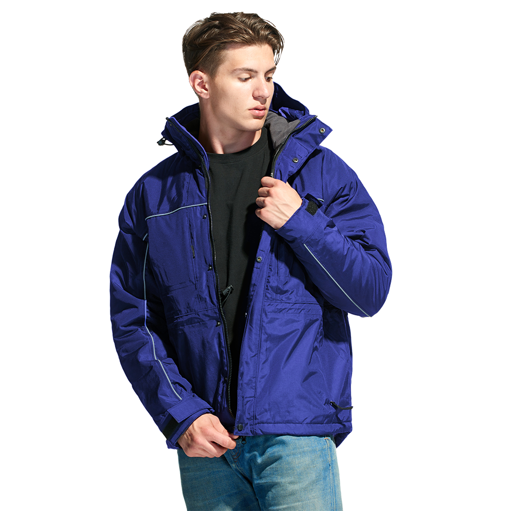 Утепленная куртка на молнии с дополнительными потайными кнопками. Со светоотражающей полоской. Капюшон отстегивается. Регулируемые манжеты на липучках. На талии — регулируемый шнурок.