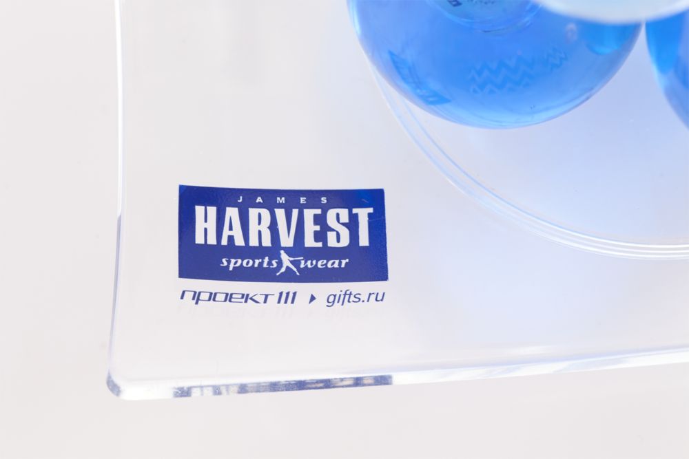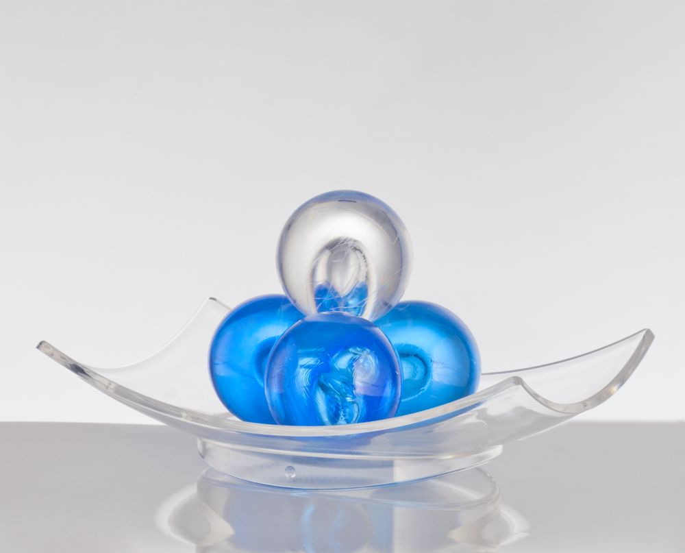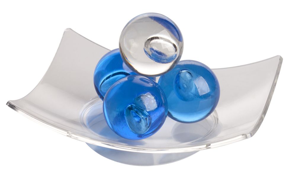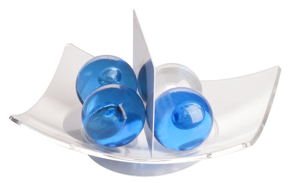 В комплекте: 3 синих шарика и 1 прозрачный, подставка, инструкция.