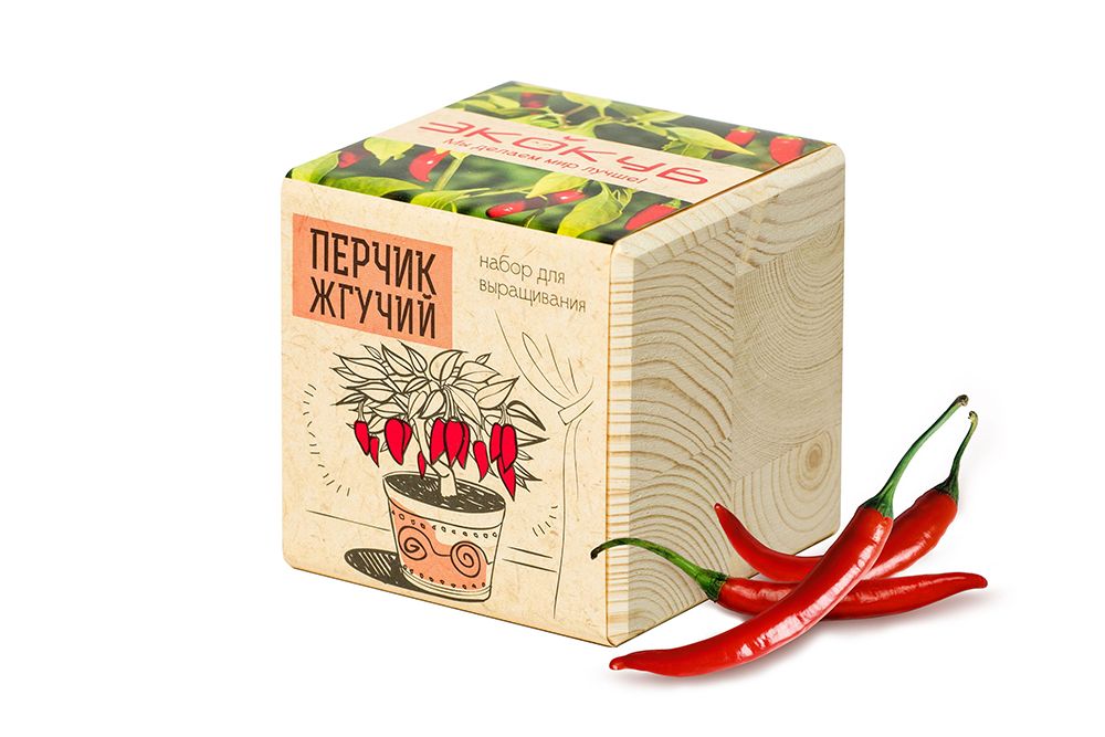 В наборе: деревянный куб, грунт, семена жгучего перца.