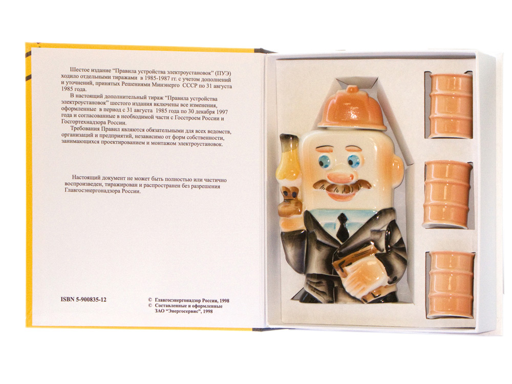 Оригинальный вариант оформления подарка на День Энергетика для специалистов в этой области. Книга скрывает в себе флягу, стилизованную под веселого энергетика, и три керамических стопки в виде топливных бочек. Заряд позитива суровым энергетикам обеспечен!