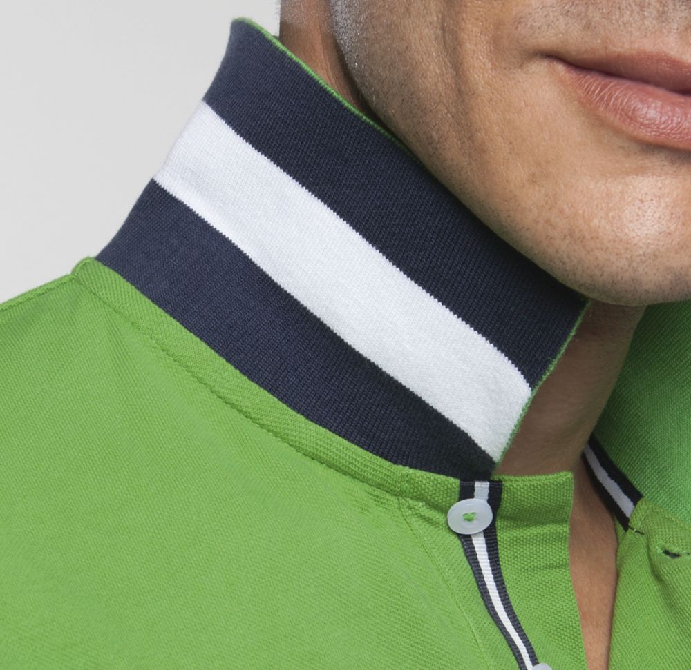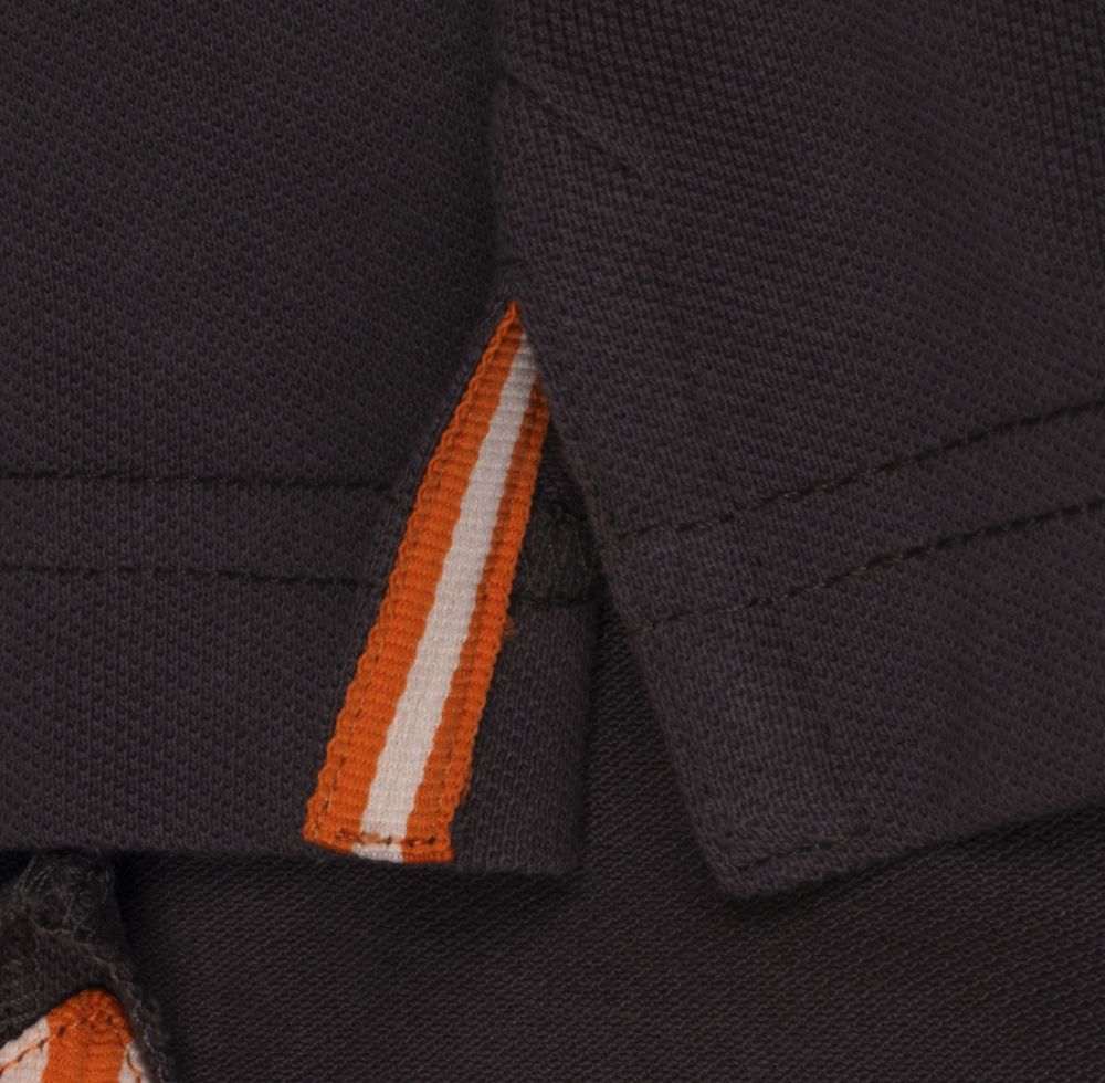 Двухцветная контрастная обратная сторона воротника. Усиленная планка с двумя белыми перламутровыми пуговицами, контрастная полоска на планке и на внутренней тесьме по вороту. Декоративная двухцветная вставка на внешней стороне рукава и на боковых разрезах по низу изделия (изнутри).