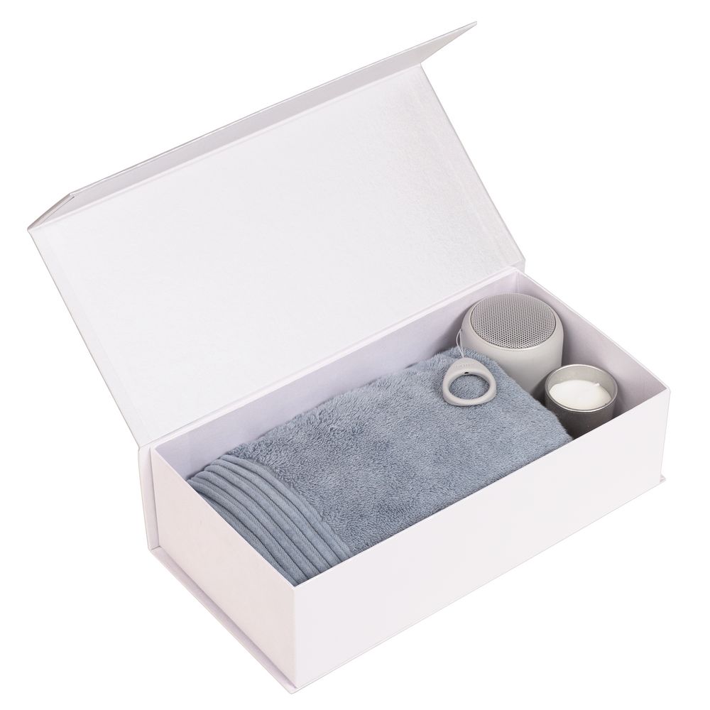 Коробка изготовлена из переплетного картона, кашированного дизайнерской бумагой Majestic.