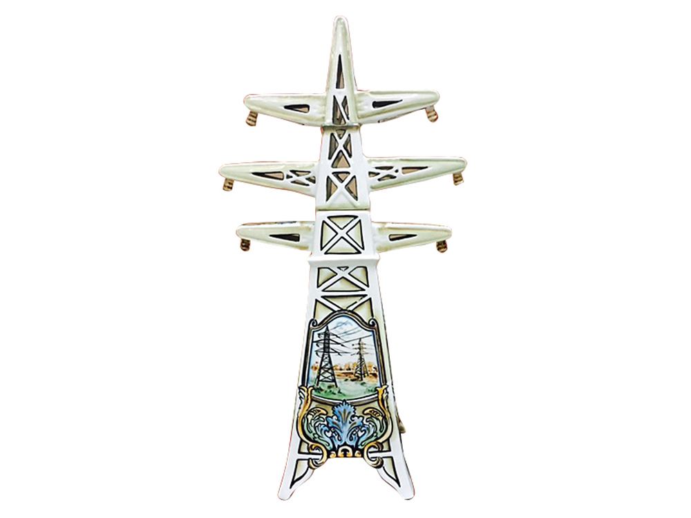 Штоф в виде вышки линий электропередач удивит любого работника электроэнергетики. Такой сувенир не будет пылиться на полке, а станет необычным украшением праздничного стола. Фарфор, цветная роспись с позолотой.