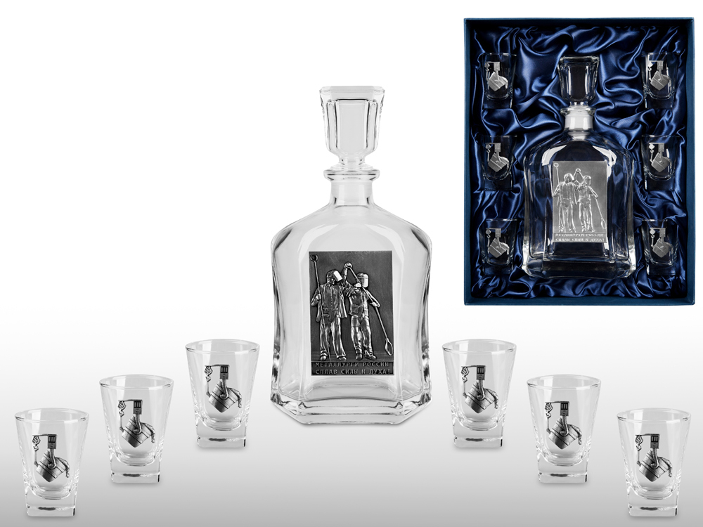 Набор для водки со штофом «Металлургический» - это отличный VIP-подарок для представителей металлургической отрасли. Подарок упакован в стильную подарочную упаковку, а сохранность набора гарантирует шелковый ложемент, который приятно оттеняет литье.