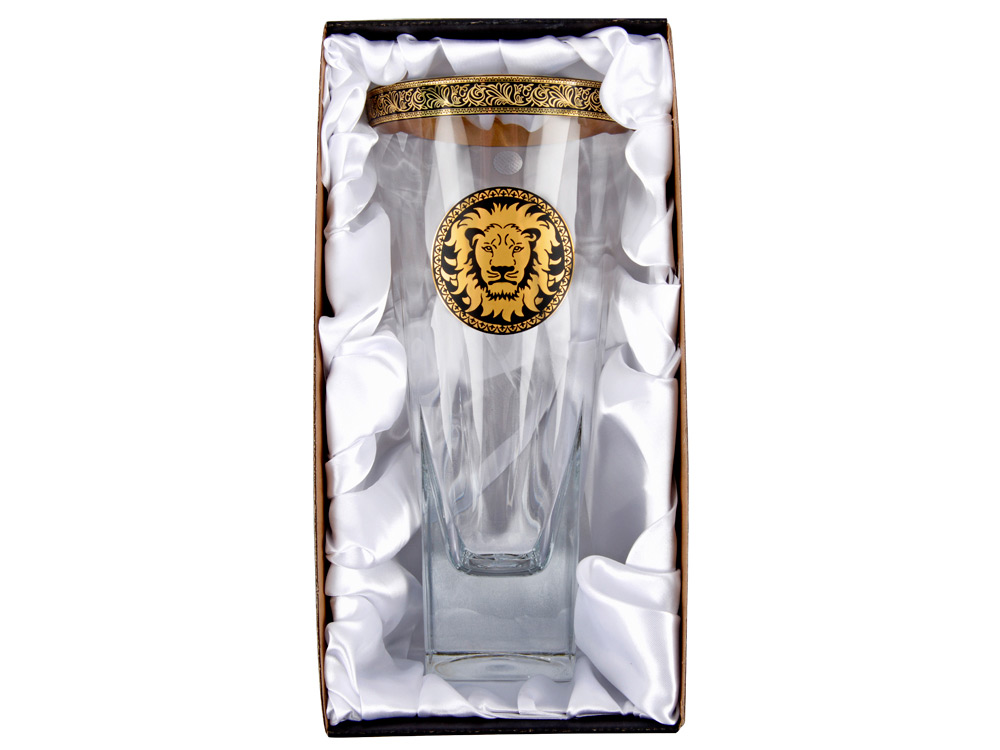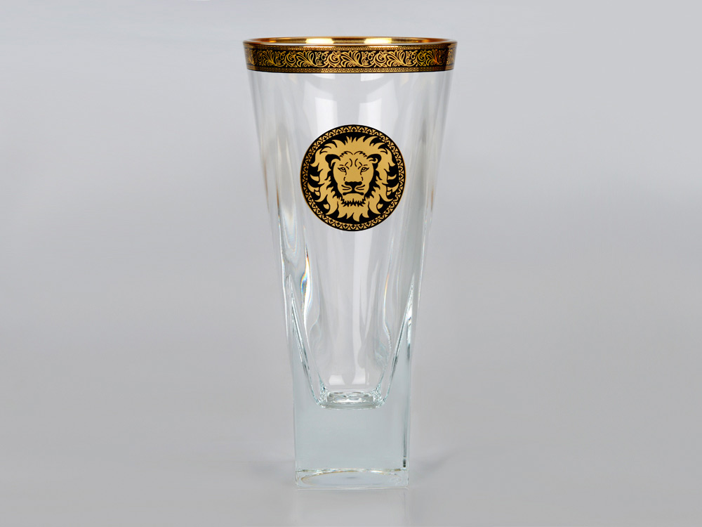 Ваза с изображением льва станет отличным украшением интерьера. Ваза выполнена из высококачественного прозрачного хрусталя с окантовкой из золотистого орнамента. В комплекте прилагается подарочная упаковка.