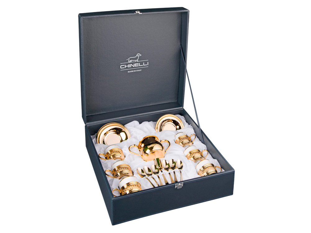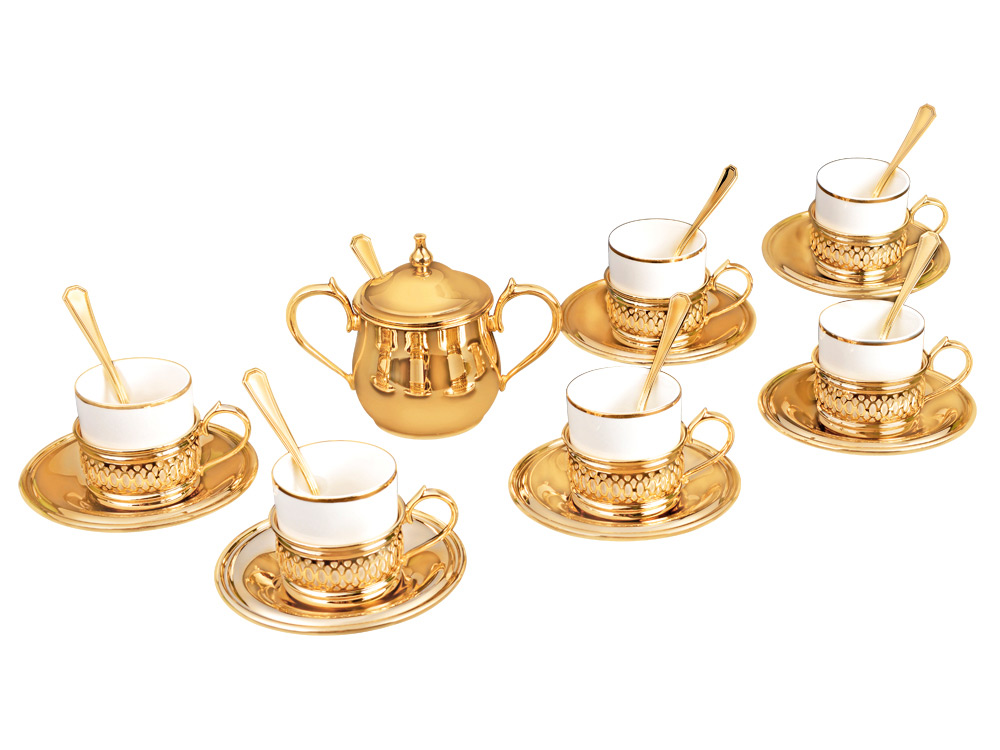 Роскошный кофейный набор состоит из белоснежных керамических чашек, подстаканников, блюдец, ложек и сахарницы золотистого цвета. Вместительный футляр позволит торжественно вручить подарок, а также пригодится для дальнейшего хранения.