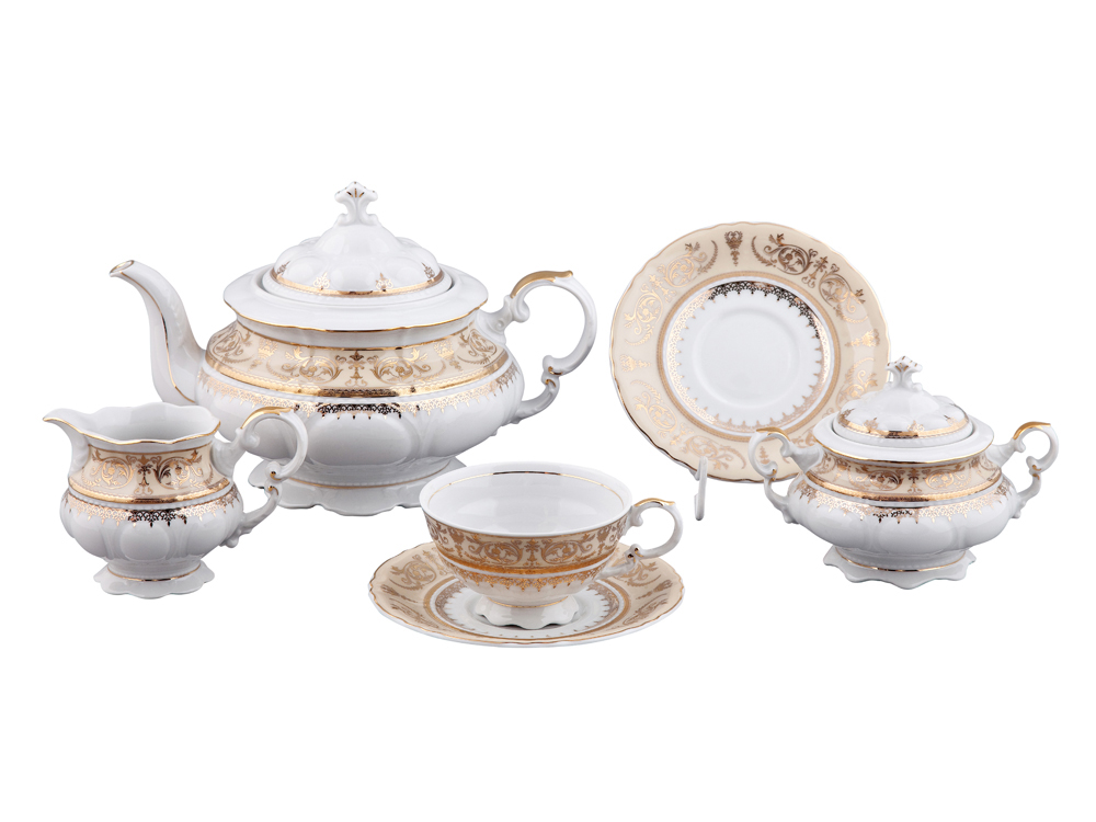 Сервиз чайный всемирноизвестного чешского бренда Rudolf Kampf - синоним красоты и прочности твердого фарфора. Роскошный сервиз для чайной церемонии выполнен в стиле Рококо и относится к коллекции National Traditions. Все 15 предметов, рассчитанных на шесть персон, расписаны вручную позолотой 24 карата. Витиеватые ручки чашечек, сахарницы, молочника и чайника придают особую изысканность и легкость. Купить сервиз, конечно же, вы можете в подарок на любое торжество. Коллекция NT создана в 20-х годах XX века и берет свою основу из стилистики Рококо.