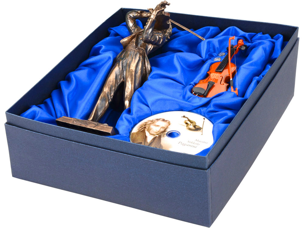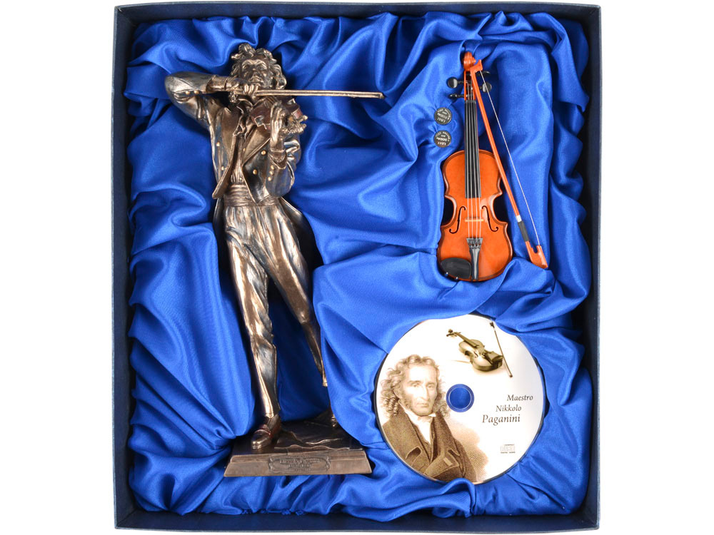 Набор «Великий Паганини» - это, наверное, самый необычный и в то же время запоминающийся подарок. В набор входят: миниатюрная скульптура, которая передает всю экспрессию, талант и вдохновение Маэстро; модель скрипки, которая является не просто муляжом - стоит к ее струнам прикоснуться смычком, и зазвучит очаровательная мелодия; и, наконец, диск с хитами Паганини. Дарить такой набор стоит тем, кто, по Вашему мнению, достиг совершенства.