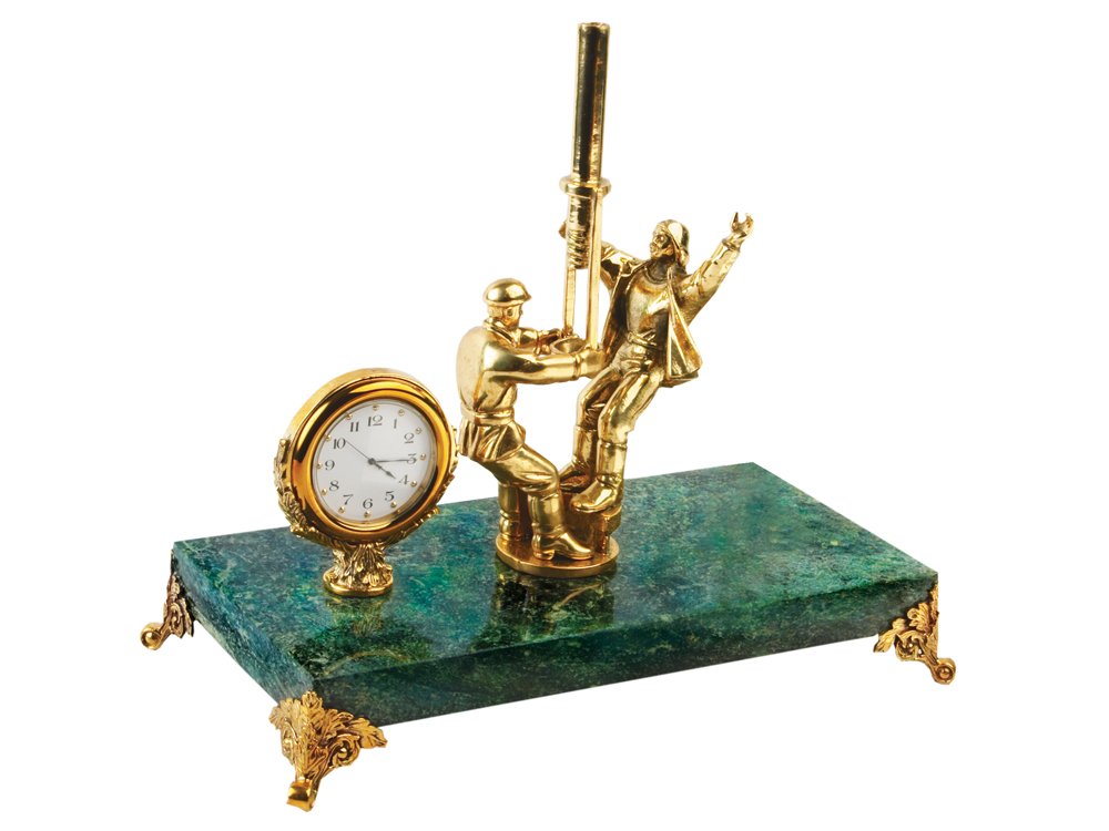 Отличный презент для руководителей и деловых партнеров в нефтедобывающей сфере. Настольный прибор, выполненный из натурального змеевика и бронзы, украшен фигурами рабочих, добывающих нефть.