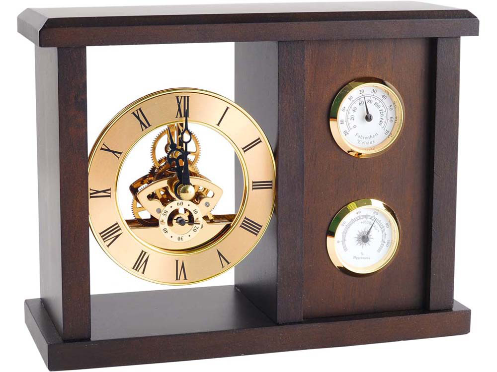 Шикарная погодная станция «Манчестер», стилизованная под красное дерево, отлично впишется в самый консервативный кабинет. В комплект входят барометр, термометр и часы. Стимпанковский дизайн циферблата часов оригинален ровно настолько, чтобы смотреться стильно, но не требовать стилизации «под себя».
