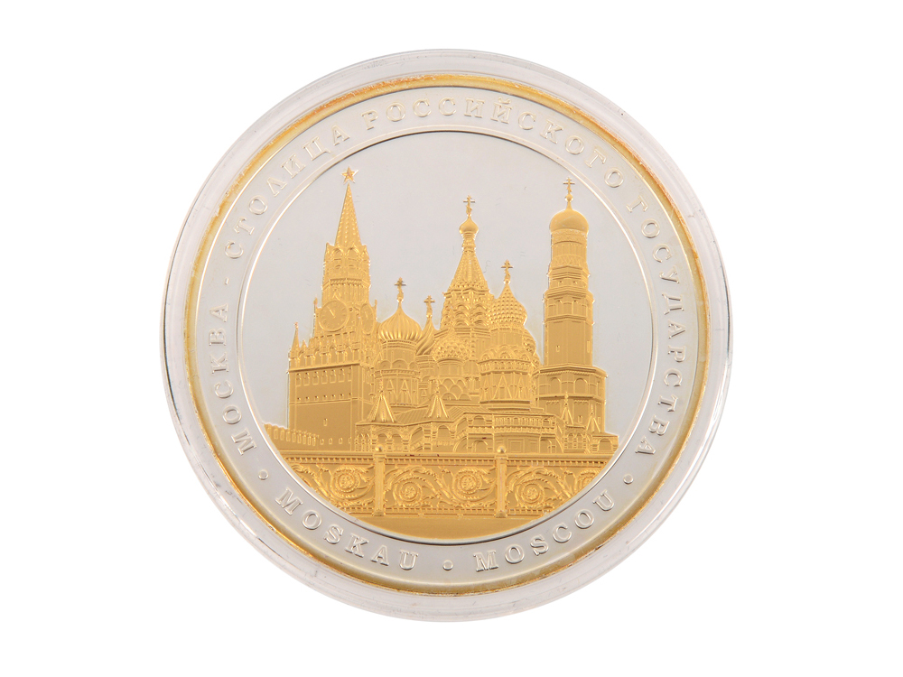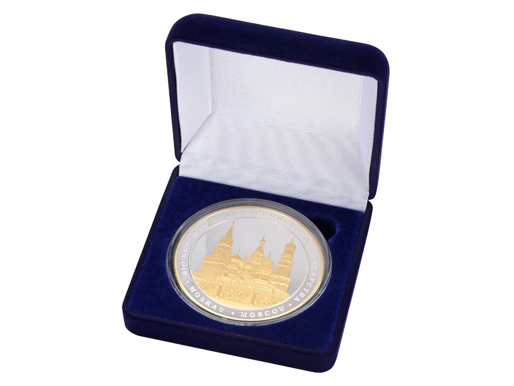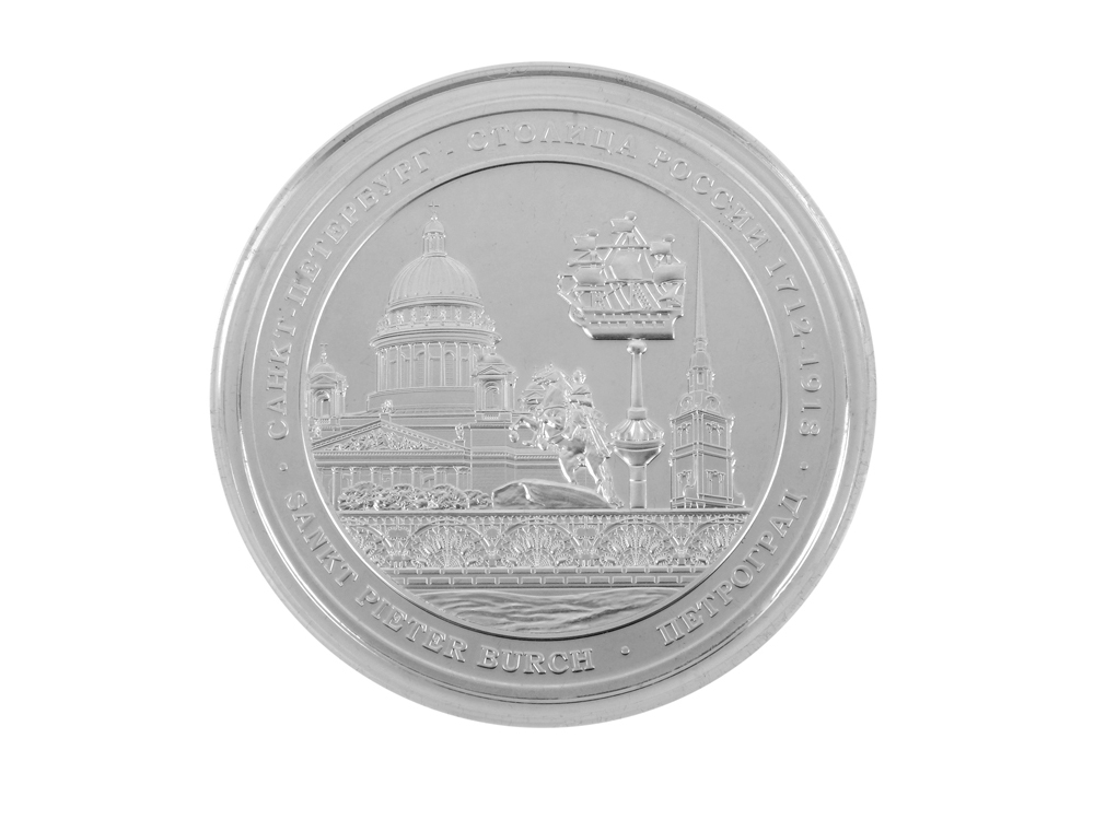 Медаль выполнена по технологии "proof". На обороной стороне применена редкая техника одновеременного покрытия металла золотом и серебром. На лицевой стороне медали изображена Москва - столица России. На обратной стороне медали изображен Санкт-Петербург - столица России с 1712 по 1918г. Диаметр - 65 мм. Медаль выпущена ограниченной серией 1000шт. Медаль упакована в футляр синий бархатный (с ложементом под медаль). Сертификаты на русском и английском языке прилагаются.